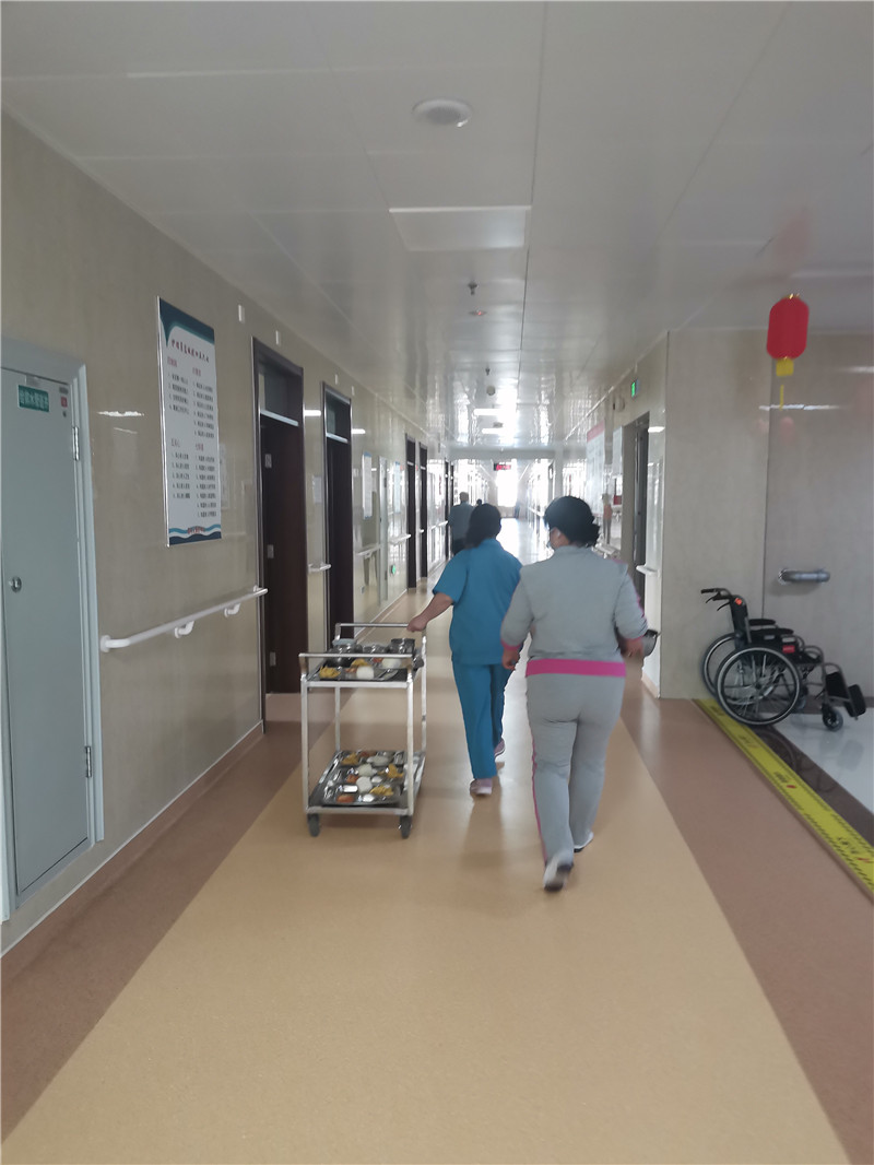每天早晨6:30護(hù)理員們開(kāi)始幫助老人分飯,然后把飯送到每一位老人的房間,老人飯后再去收拾餐具。