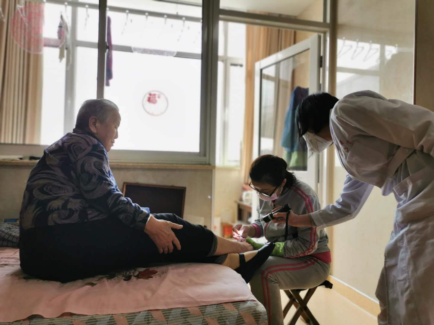 早飯過(guò)后,開(kāi)始為老人整理房間,打掃床鋪,消毒桌面,開(kāi)窗通風(fēng),為老人打水;忙活完后,為老人測(cè)試體溫,有異常的趕緊上報(bào)醫(yī)護(hù)人員進(jìn)行處理,沒(méi)有藥的幫助老人去買(mǎi)藥,督促老人服藥,督促老人多喝水。午后再次檢測(cè)體溫,為老人打水、晾曬洗衣房為老人洗好的衣服;每天都是這樣做著這些平凡而有意義的事情。