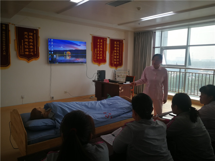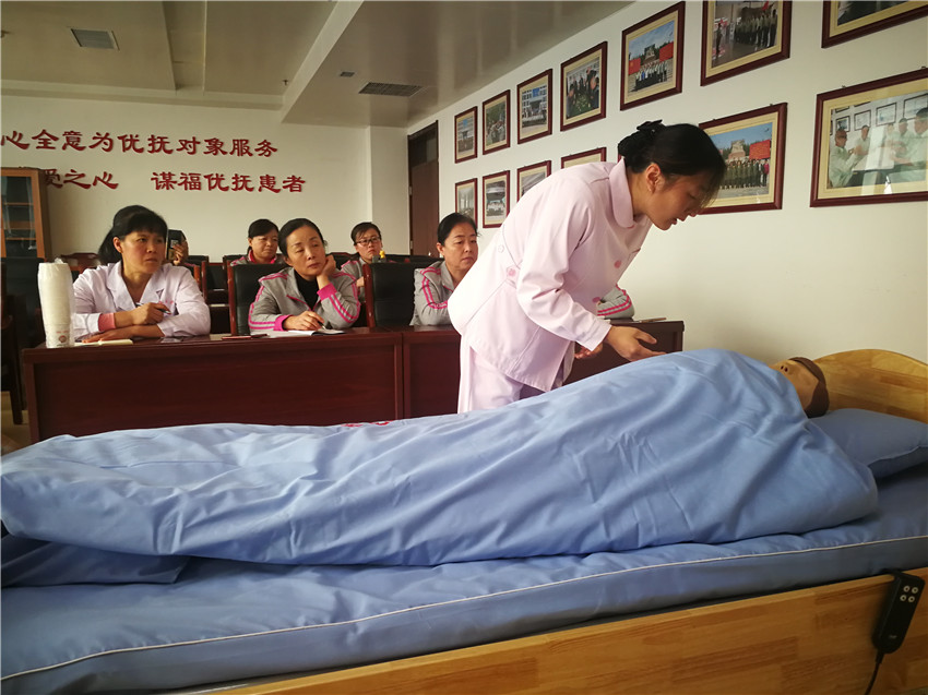 上午,濱州市優(yōu)撫醫(yī)院院長(zhǎng)牛希國(guó)與淄博市社會(huì)福利院王洪玉副院長(zhǎng)一行進(jìn)行了深入交談溝通。首先,牛希國(guó)院長(zhǎng)感謝淄博社會(huì)福利院王院長(zhǎng)一行為我院養(yǎng)老工作傳經(jīng)送寶,向王院長(zhǎng)一行介紹了我院老年人養(yǎng)護(hù)中心工作現(xiàn)狀。并就老年人養(yǎng)護(hù)中心如何進(jìn)行管理、宣傳、醫(yī)療、護(hù)理等工作進(jìn)行了深入交談。同時(shí),由淄博市社會(huì)福利院護(hù)理員培訓(xùn)師王壯同志對(duì)我院養(yǎng)護(hù)工作人員進(jìn)行業(yè)務(wù)和實(shí)際操作能力的培訓(xùn),并現(xiàn)場(chǎng)演示了老年人護(hù)理和急救技能操作。