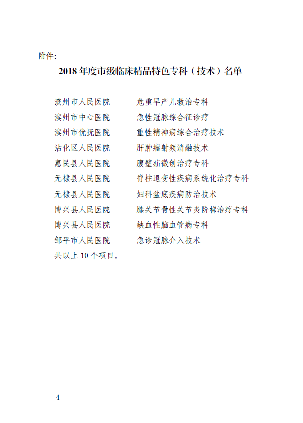 近日,濱州市衛(wèi)生健康委員會、濱州市發(fā)展和改革委員會、濱州市市場監(jiān)督管理局聯(lián)合發(fā)布全市10家市級臨床精品特色??疲夹g(shù))名單,我院申報的“重性精神病綜合治療技術(shù)”名列其中。
