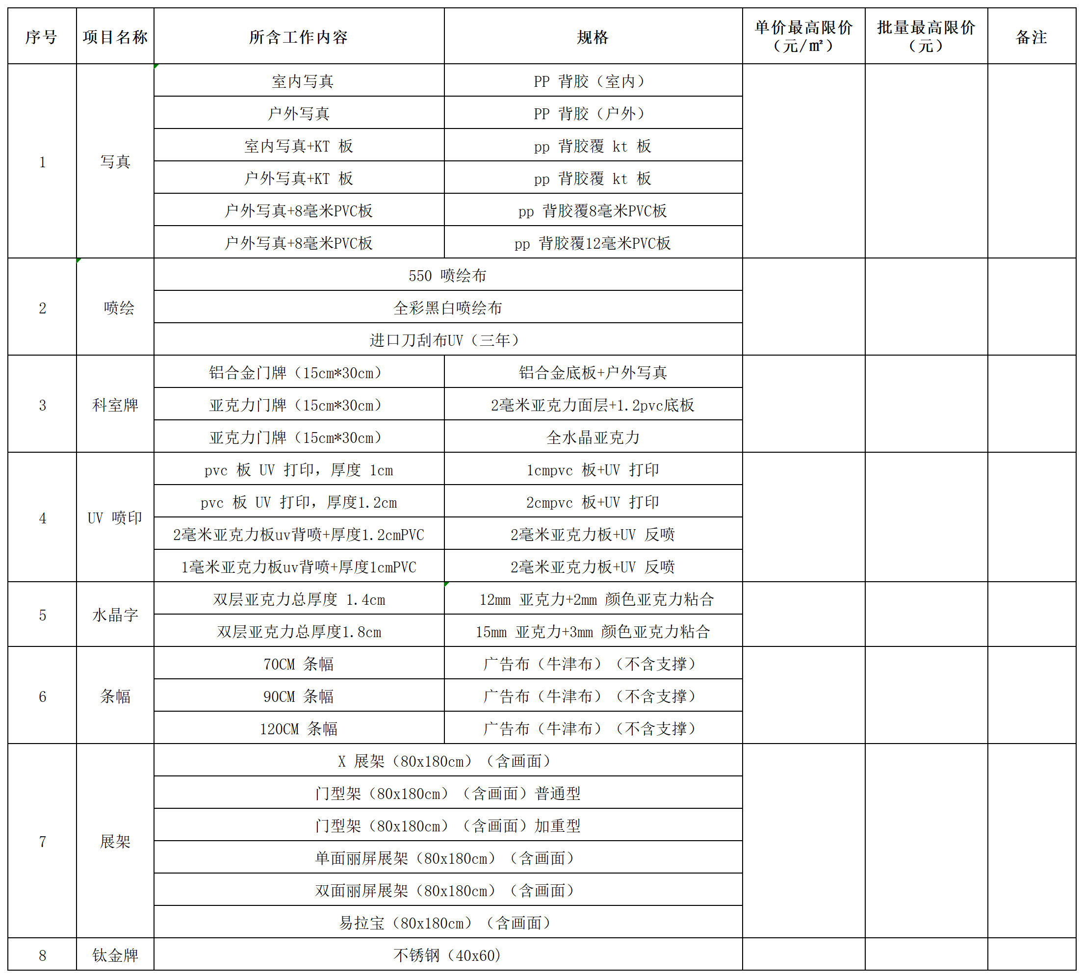 6、報價清單,需詳細(xì)列明公司可制作的各類圖文廣告,制作項目的單價、總價、材質(zhì)、規(guī)格等(參考附件)。